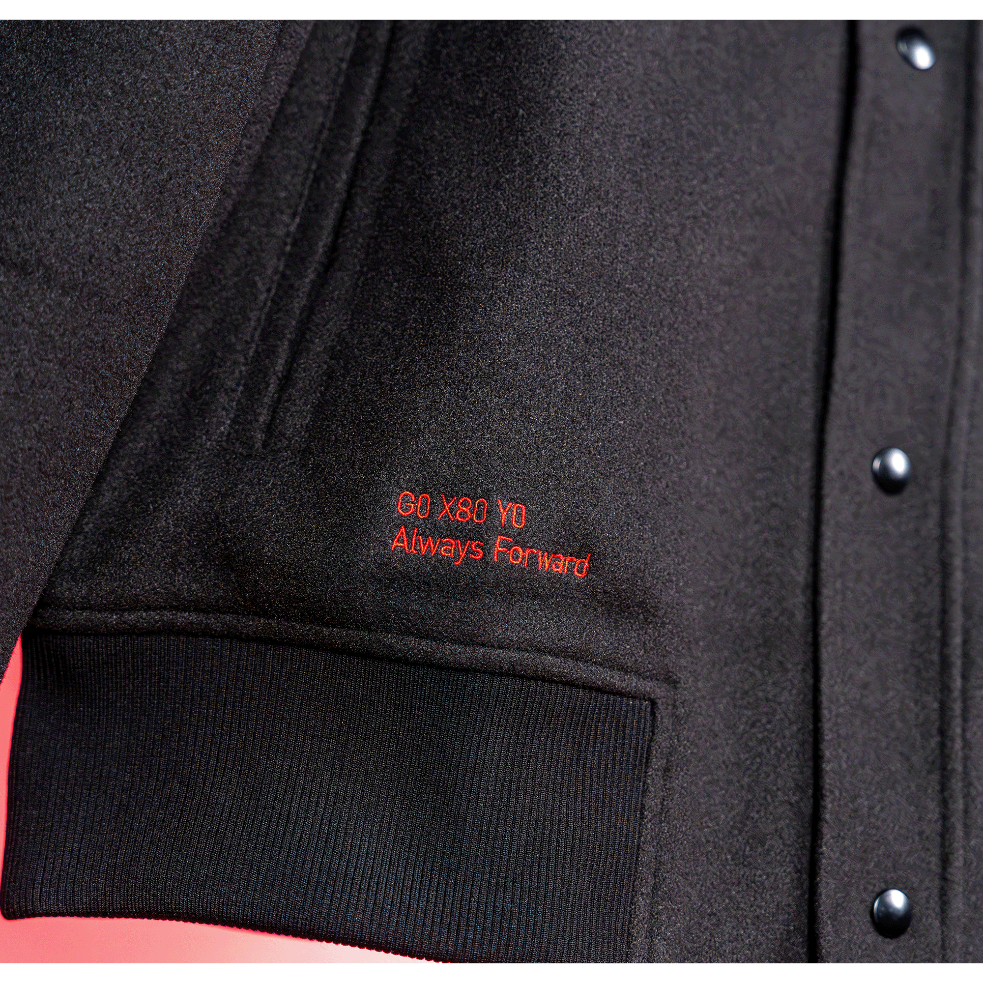 College-inspired jacket with classic collar and snap-button closure. Brand-themed applications and contrast stitching add a technical, sporty look. Made from a viscose blend with a smooth finish and firm feel. Lightly lined for transitional wear.